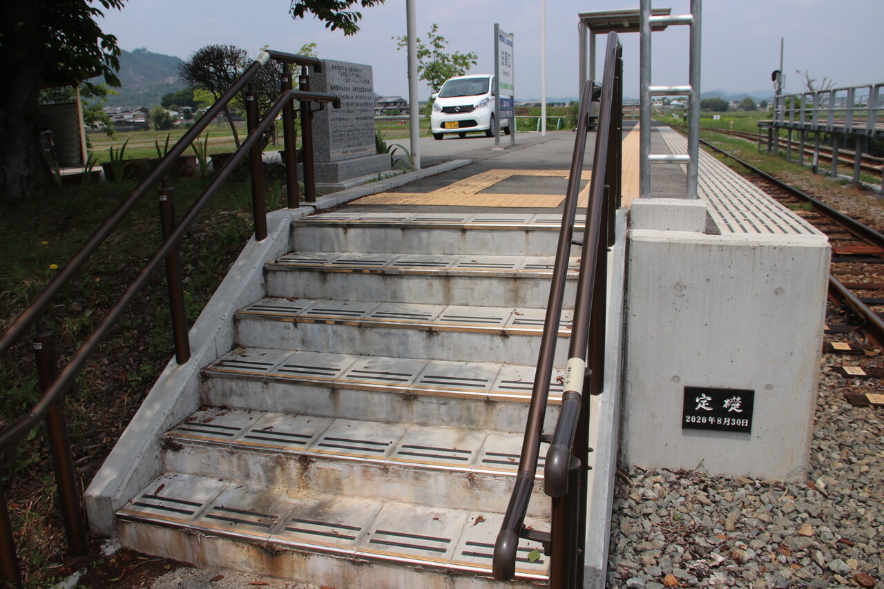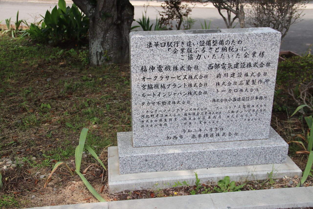 1番線ホーム上に、法華口駅行き近い設備整備のため「企業版ふるさと納税」にご協力いただいた企業様の石碑