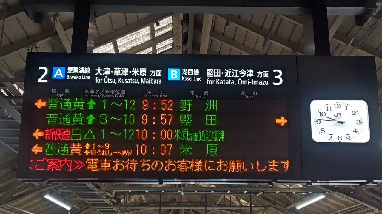 新快速 白△ 1~12 10:00 米原方面近江塩津の発車標(日本語)