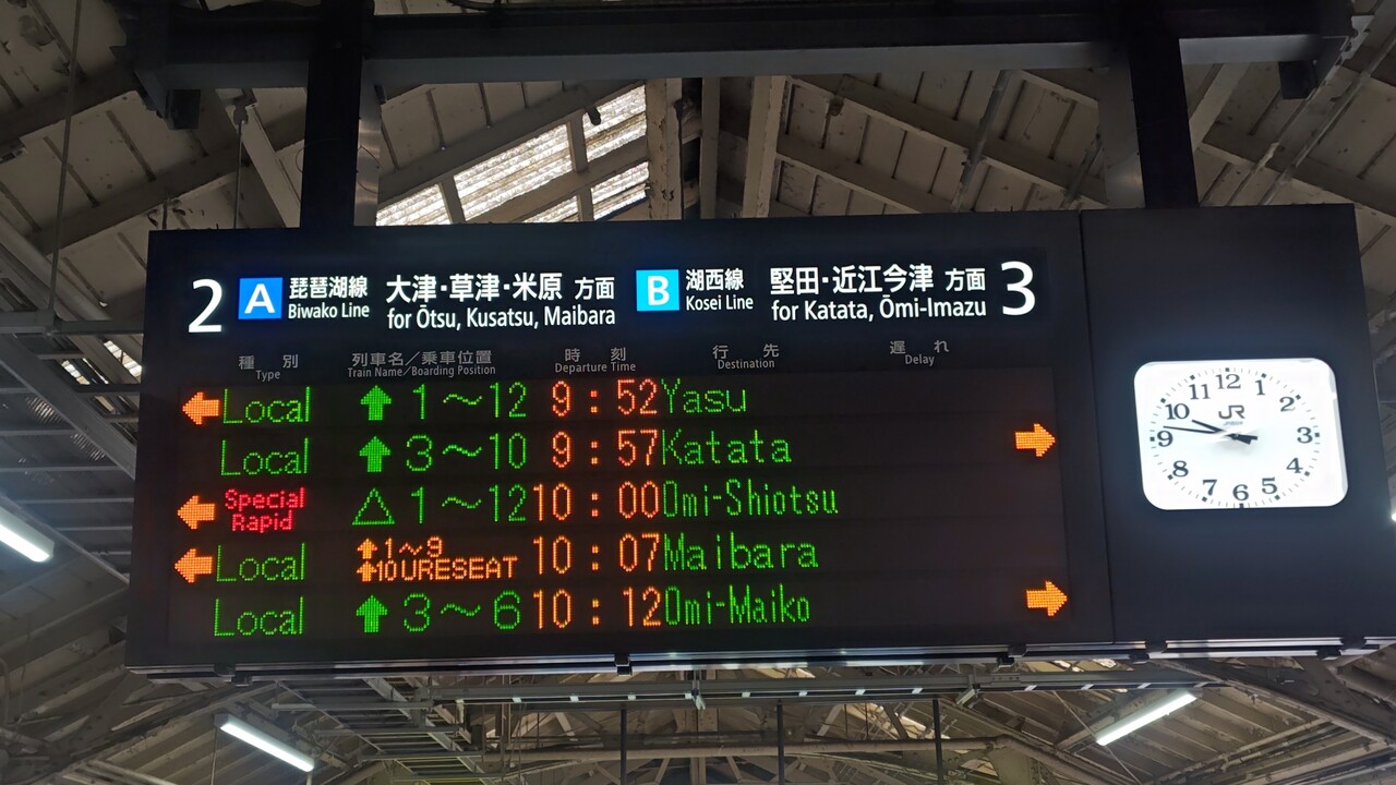 Special Rapid △ 1~12 10:00 Omi-Shiotsuの発車標(英語)