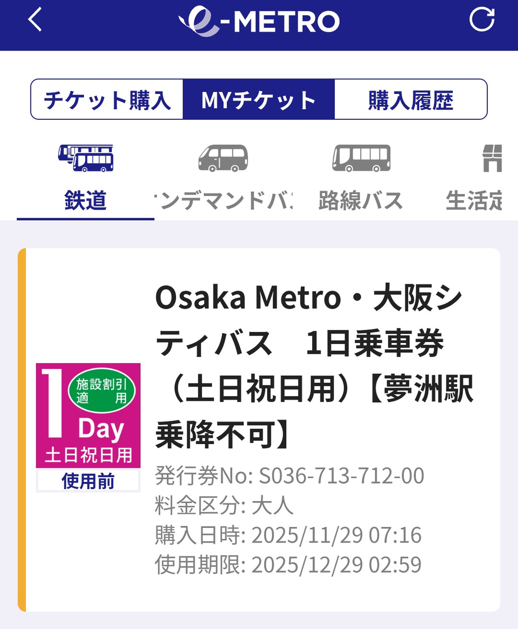 Osaka Metro・大阪シティバス 1日乗車券(土日祝日用)【夢洲駅乗降不可】を使う。