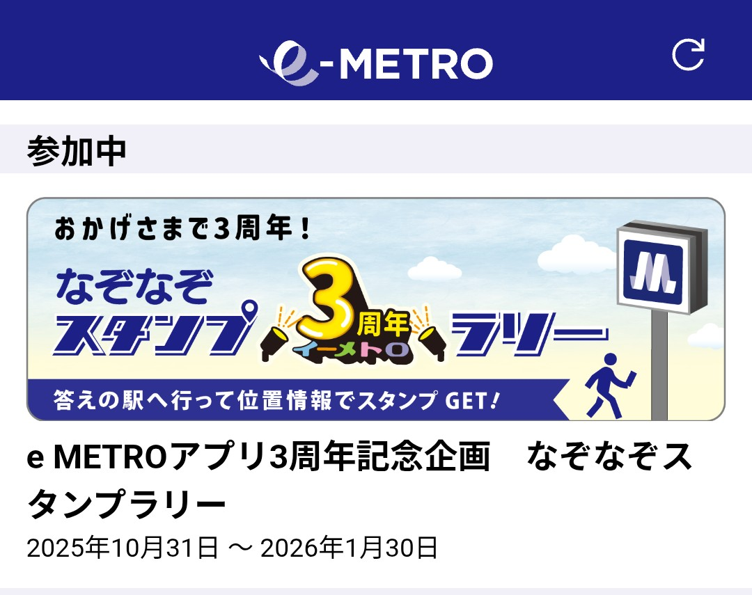 e-METROのアプリから、eMETROアプリ3周年記念企画 なぞなぞスタンプラリーに出る。