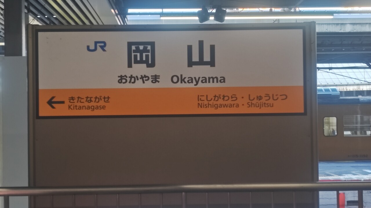 岡山地区の駅名標は、壁に設置がペイントされた様式に変わっている。